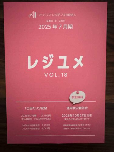 アドバンス・レジデンス投資法人(3269)から第30期資産運用報告とレジユメvol.18が届きました。 毎回、表紙が印象的なレジユメですが、今回は非常にシンプルでした。ちょっと力抜いてる感があります。 本法人は、住宅特化系では、日本最大級の保有資産規模…
