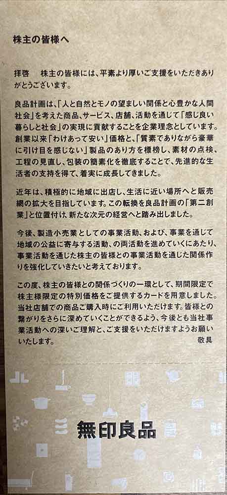 2023-05-06 【株主優待】良品計画(7453) 日本株 株主優待 良品計画(7453)から株主優待が届きました。 前回は隠れ優待?でしたが、今回から正式な優待となりました。 無印良品でありがたく使用したいと思います。 以下は過去の記事です。 sophisticated-life.hatenadiary.jp