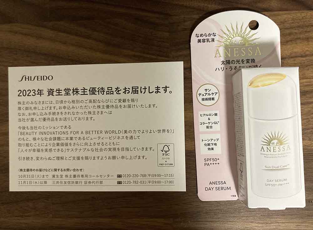 2023-05-13 【株主優待】資生堂(4911) 日本株 株主優待 資生堂(4911)から以前注文した株主優待が届きました。 sophisticated-life.hatenadiary.jp アネッサという日焼け止めを頼んでみました。 ありがたく使わせていただきます。 以下は過去の記事です。 sophisticated-life.hatenadiary.jp sophisticated-life.hatenadiary.jp sophisticated-life.hatenadiary.jp